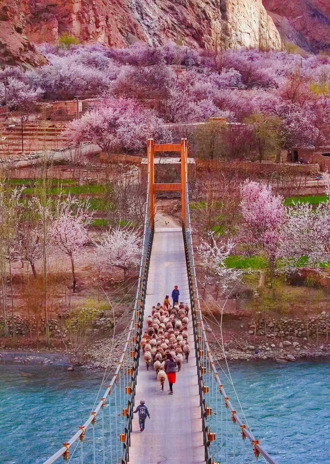 這裏杏花密集,古杏樹遍佈村落,塔吉克民居藏於花海中,煙火氣十足;打卡幸福五號橋,杏花垂枝、溪水潺潺,是春日必拍點位。