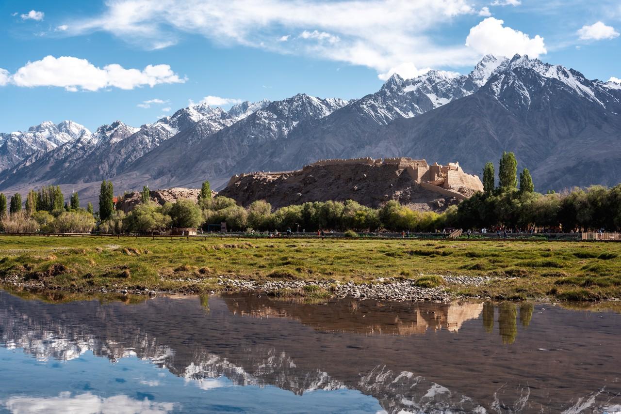 背靠慕士塔格峯與公格爾九別峯,雪山倒映湖面,盡顯高原壯闊。