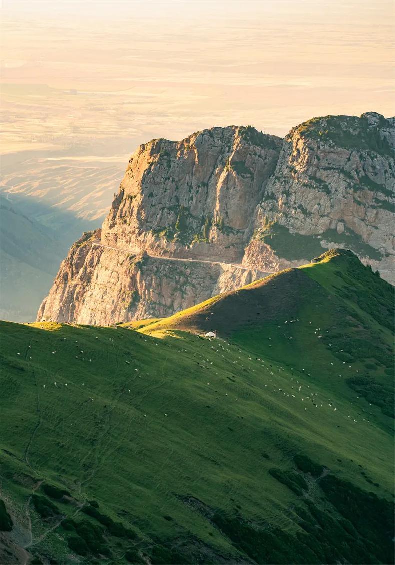 看羊羣如雲朵般散落在綠色的海洋。