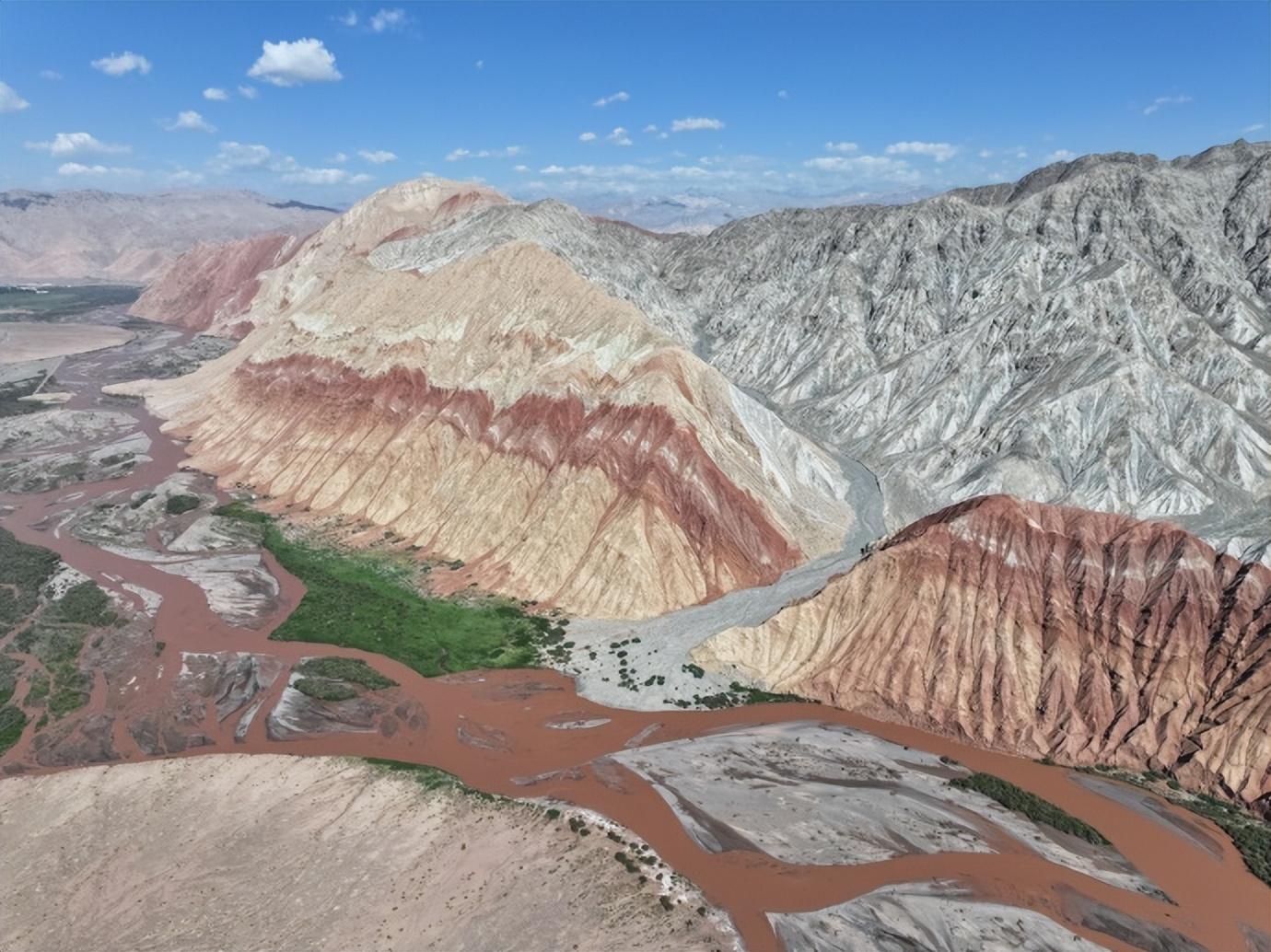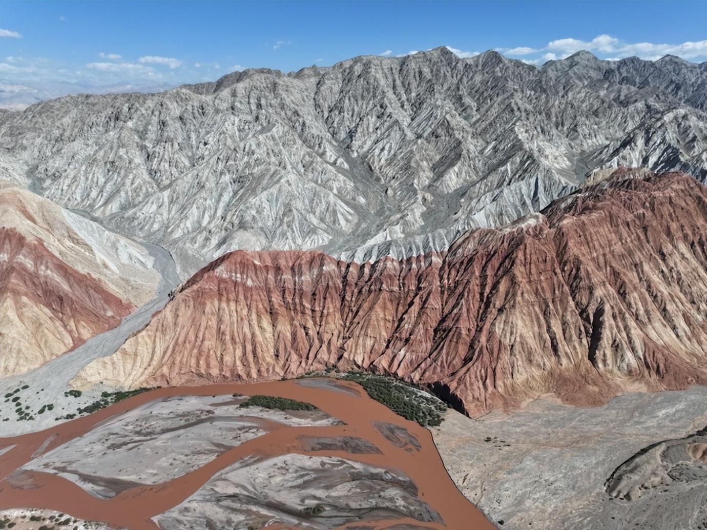 天山山脈在此處呈駝色,崑崙山山脈呈黛色。天山靠前,宛如一位身着駝色百褶裙的秀美女子;崑崙山靠後,則像是一位披着滿身傷痕的雄壯勇士。