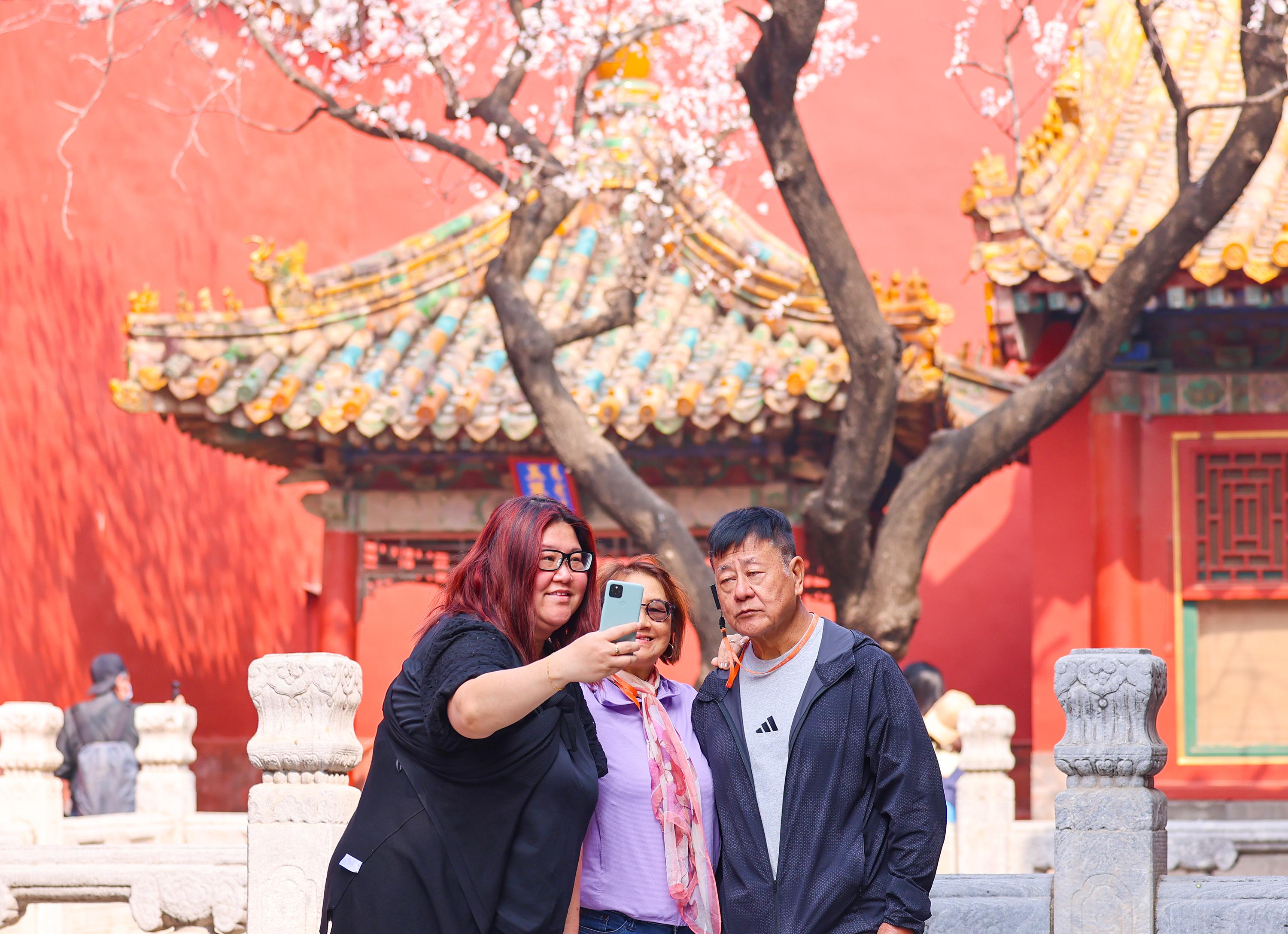 3月25日,故宮博物院坤寧西院、御花園、鍾粹宮等處的杏花嬌豔綻放,粉白花瓣綴滿枝頭,與紅牆黃瓦相映成趣。微風拂過,花瓣輕顫,盡顯靈動詩意。