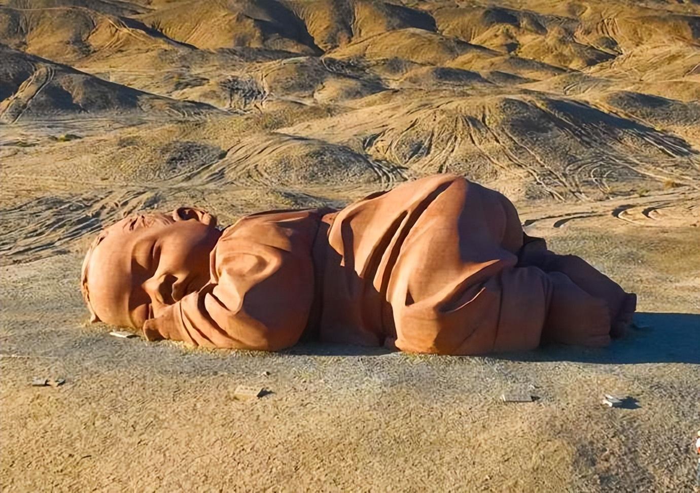 大地之子雕塑:戈壁灘上的地標性藝術作品,俯瞰視角下,一個巨大的 嬰兒蜷縮趴臥 在廣袤的戈壁上,彷彿沉睡在大地母親的懷抱中。
