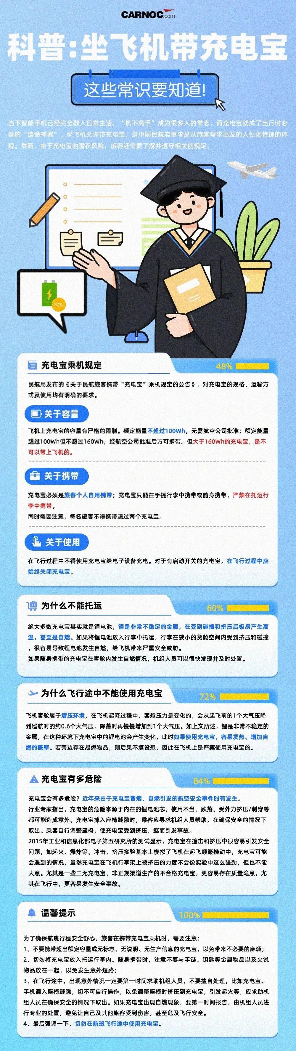 按照國內現行規定,充電寶仍需隨身攜帶、禁止託運,額定能量不超過100Wh可正常攜帶,100Wh至160Wh需經航空公司同意,超過160Wh則嚴禁帶上飛機。隨着國際新規推行,國內相關乘機要求也將逐步銜接更新。(民用航空網)