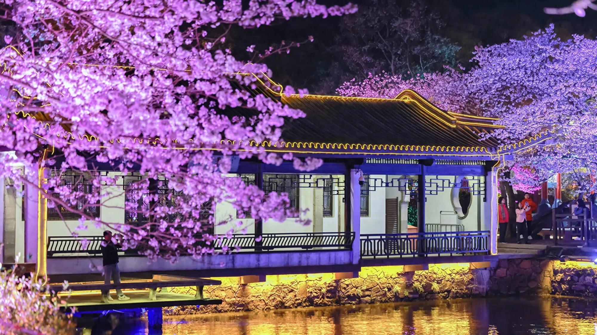 “3月底是黿頭渚最美的時候,今年櫻花節最大的亮點是賞櫻和創新體驗的結合。”黿頭渚景區策劃發展部丁婧向記者介紹,遊客掃碼體驗虛擬櫻花飄灑、查看櫻花圖鑑及趣味遊戲,與AR櫻花精靈合影生成專屬紀念海報;“機甲互動秀”在夜晚更加精彩,機器人身上的燈帶隨舞蹈節奏變換色彩與亮度,機甲在夜櫻林間舞動,光影線條與湖光、櫻花相映成趣。江南的夜色中,既有櫻花的溫柔,又有科技的炫酷。