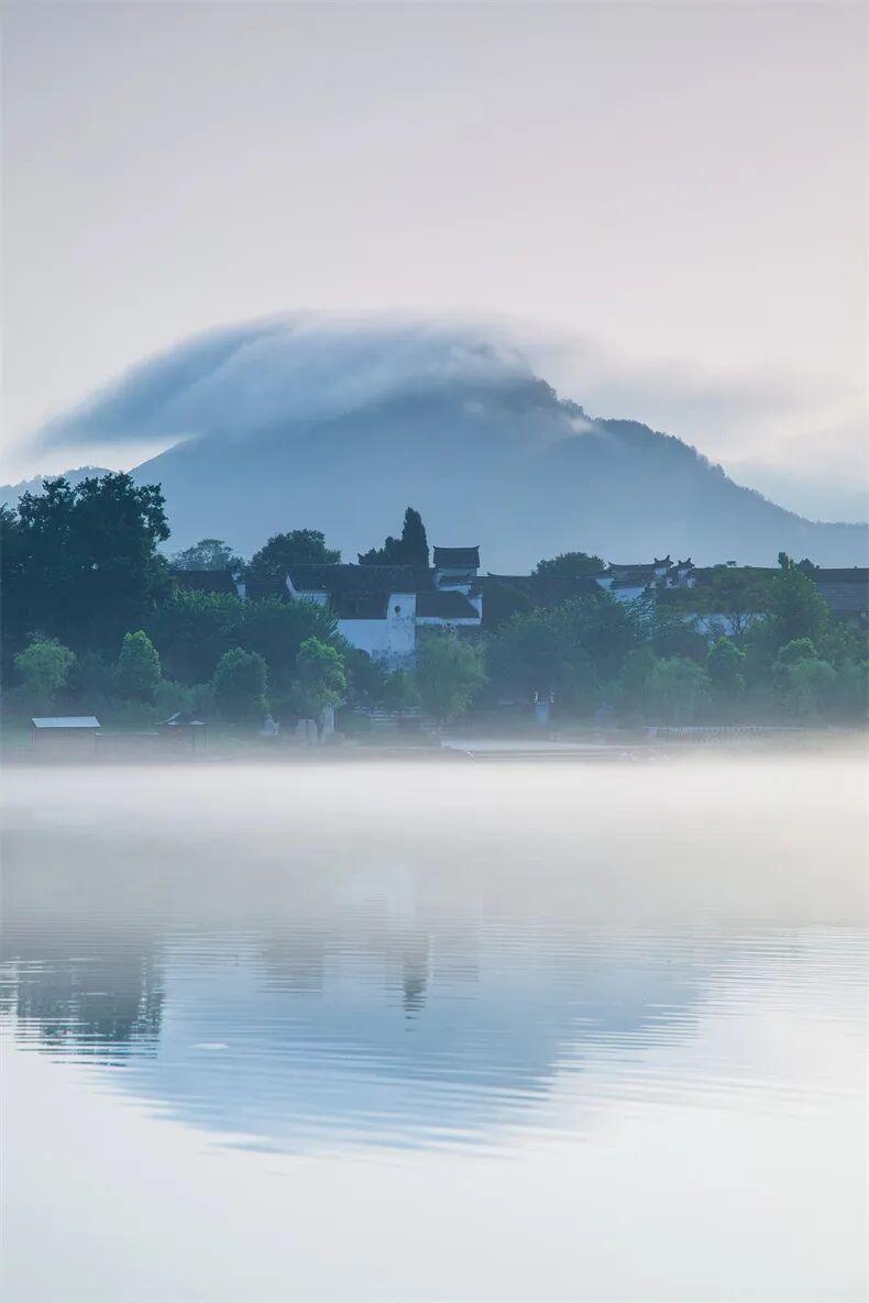 白牆黛瓦的徽派民居倒映在平靜的水面上,