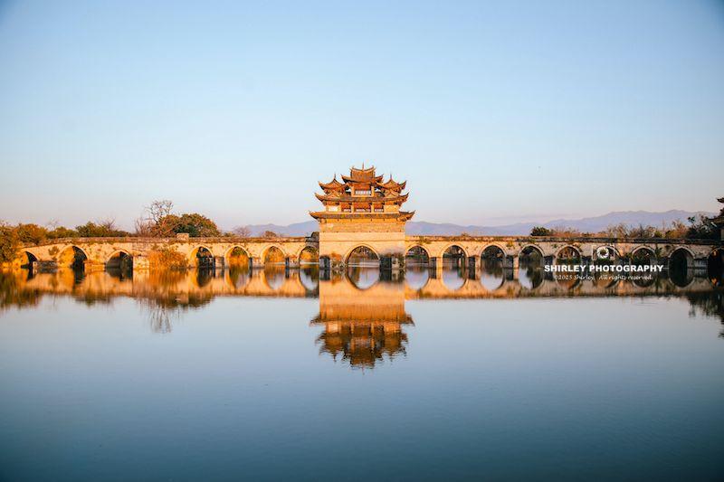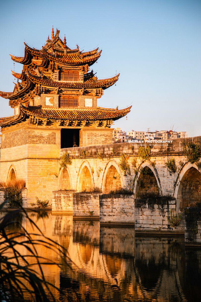 雙龍橋則在城外,距古城西邊約三公里,是一座十七孔石拱橋,橫跨瀘江與塌衝河交匯處。橋身全長一百四十八米,中間建有一座三層樓閣,遠望如長虹臥波,是滇南地區規模最大的古橋。黃昏時分來最好,夕陽把橋孔鍍成金色,是建水最經典的畫面之一。依舊記得這次在建水住的民宿,房卡上印刷的就是雙龍橋全景。