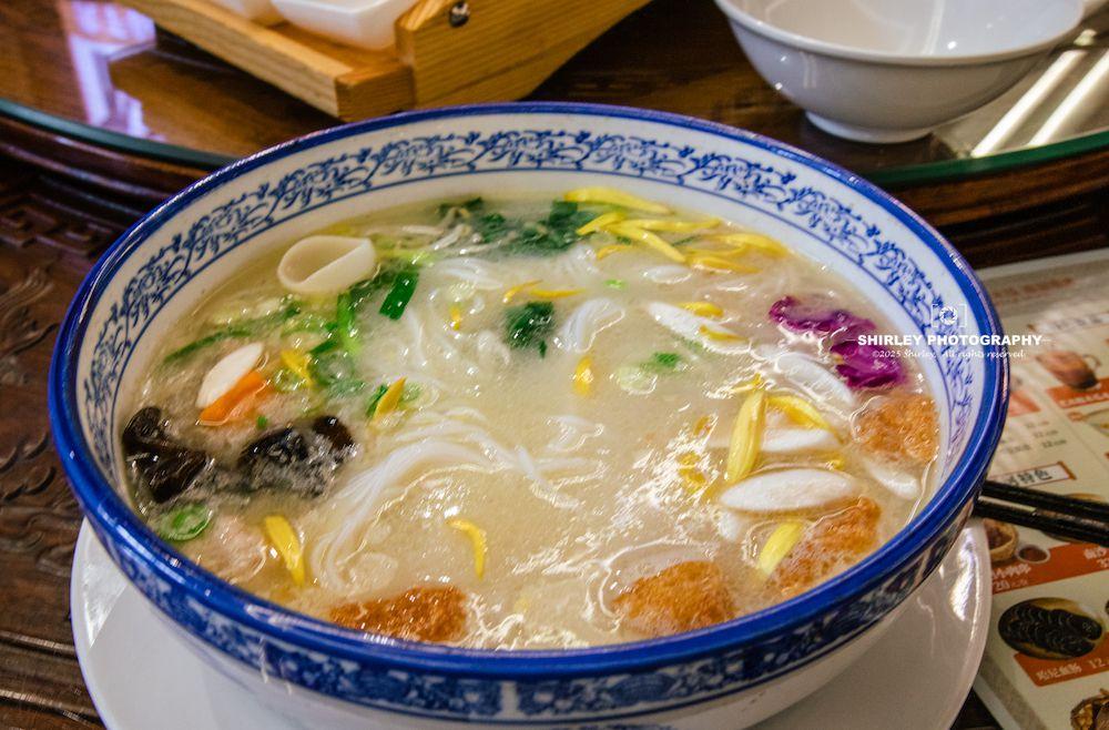 蒙自過橋米線特別講究,大碗濃湯、碟碟配菜,一端上桌就是滿滿的儀式感。高湯選用本地土雞、豬骨、筒子骨慢燉三小時以上,出鍋時還要澆一層熱豬油鎖溫,湯的中心溫度高達95℃以上,才能瞬間燙熟食材又保持鮮嫩。然後按照“先生後熟、先葷後素”的順序依次下入熱湯,再放米線,最後撒一把菊花,清涼解火,中和油膩,這是蒙自獨有的靈魂喫法。