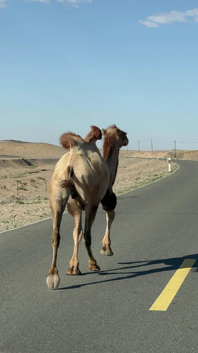 戈壁公路奔跑的駱駝