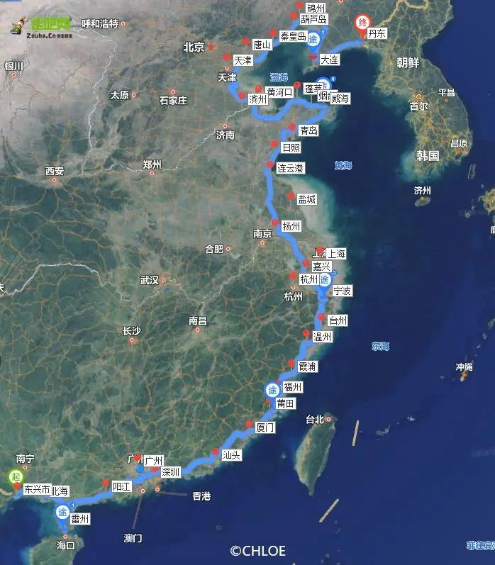 它北起點遼寧丹東,南終點廣西東興,南北跨越約20個緯度;串起溫帶、亞熱帶、熱帶各種氣候下各色海洋景觀。