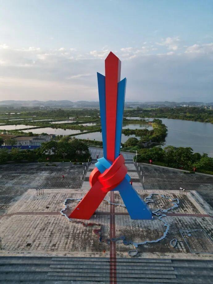 山海相連地標廣場上,35米高的“興”字雕塑矗立於海天之間,紅藍兩色交織,寓意山與海的緊握。