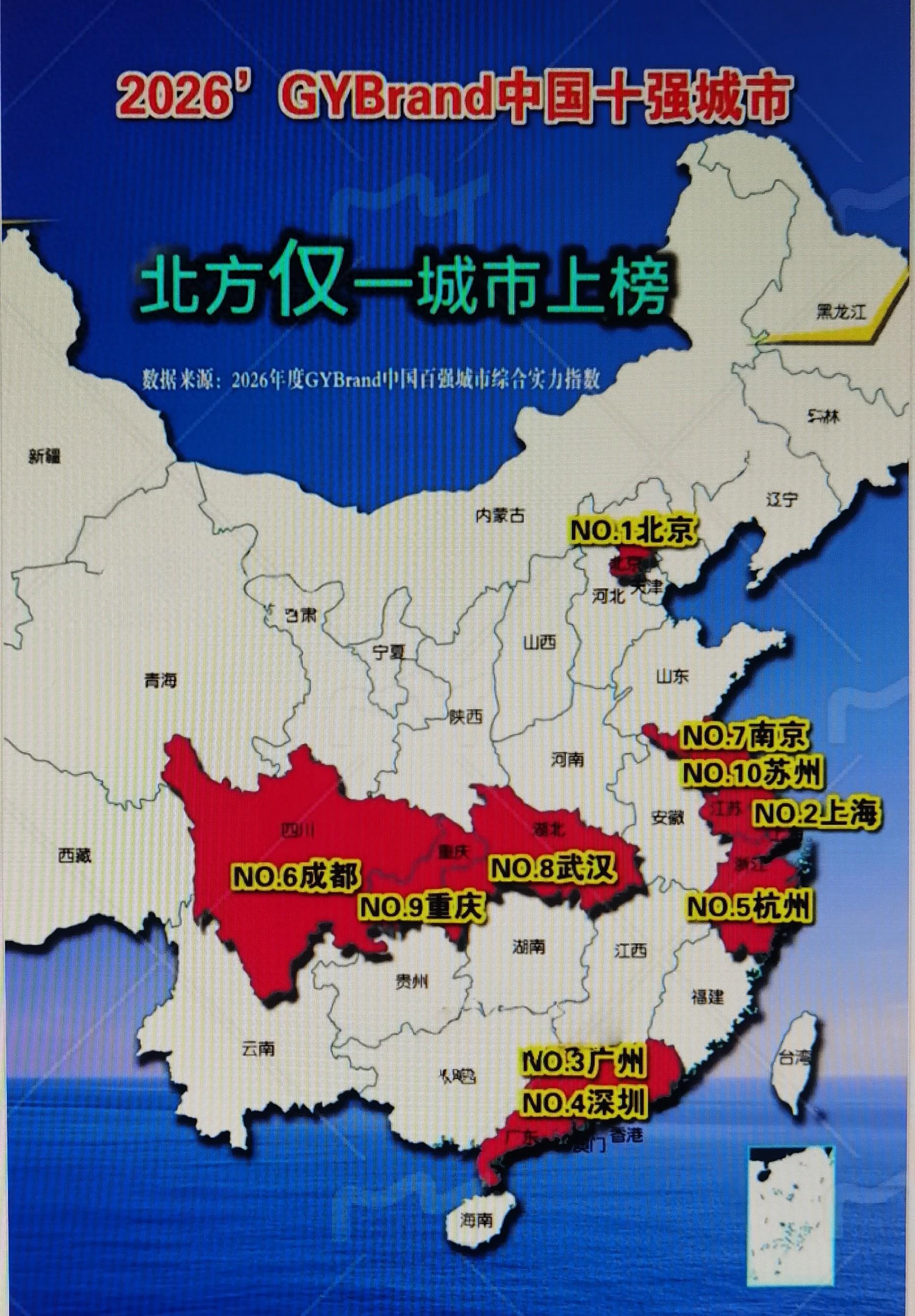 近日,城市指數研究機構GYBrand發佈了《2026年度中國百強城市指數》報告,推出了2026年中國城市綜合實力前十強榜單,前十名依次爲北京、上海、廣州、深圳、杭州、成都、南京、武漢、重慶和蘇州,北上廣深是公認的一線城市,超羣的實力無可爭議,重慶、南京、成都、武漢等城市,要麼是直轄市要麼是國家中心城市,位列其中也在情理之中,但令人意外的一個是直轄市天津的落榜,二就是地級市的蘇州憑藉經濟強勢進入前十,你認同這個排名嗎?