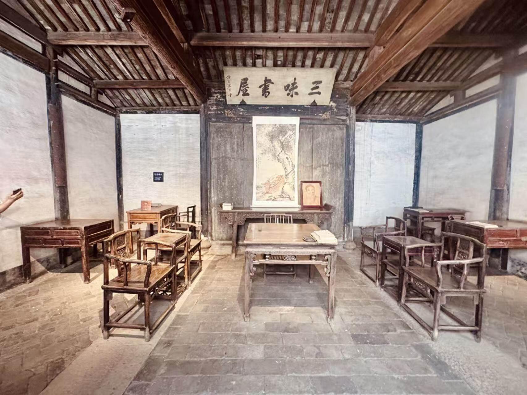 從百草園出來,往東走二三百米,一道窄窄的石橋通向三味書屋。循着黑油的竹門進去,是尺方庭院。第三間書房裏,正中間掛着“三味書屋”的匾額。匾下古畫裏,梅花鹿靜伏在古樹下。微弱光線下,在東北角靠牆的位置,我找到了那張刻着“早”字的課桌。極普通的舊式書桌,桌面刻着的“早”字筆畫依然清晰。想象當年,十幾歲的孩子,因爲給父親抓藥遲到,受先生責備,便在桌上刻字盟誓,許下不再遲到的諾言。