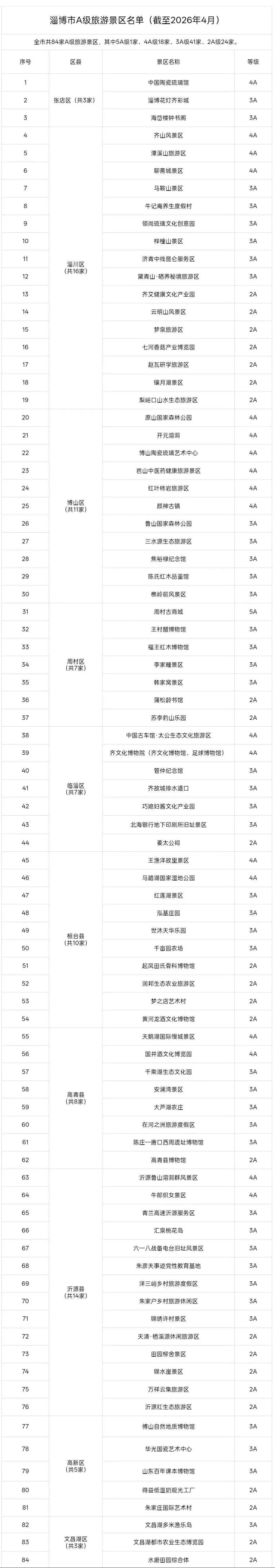 淄博全市84家A級旅遊景區
