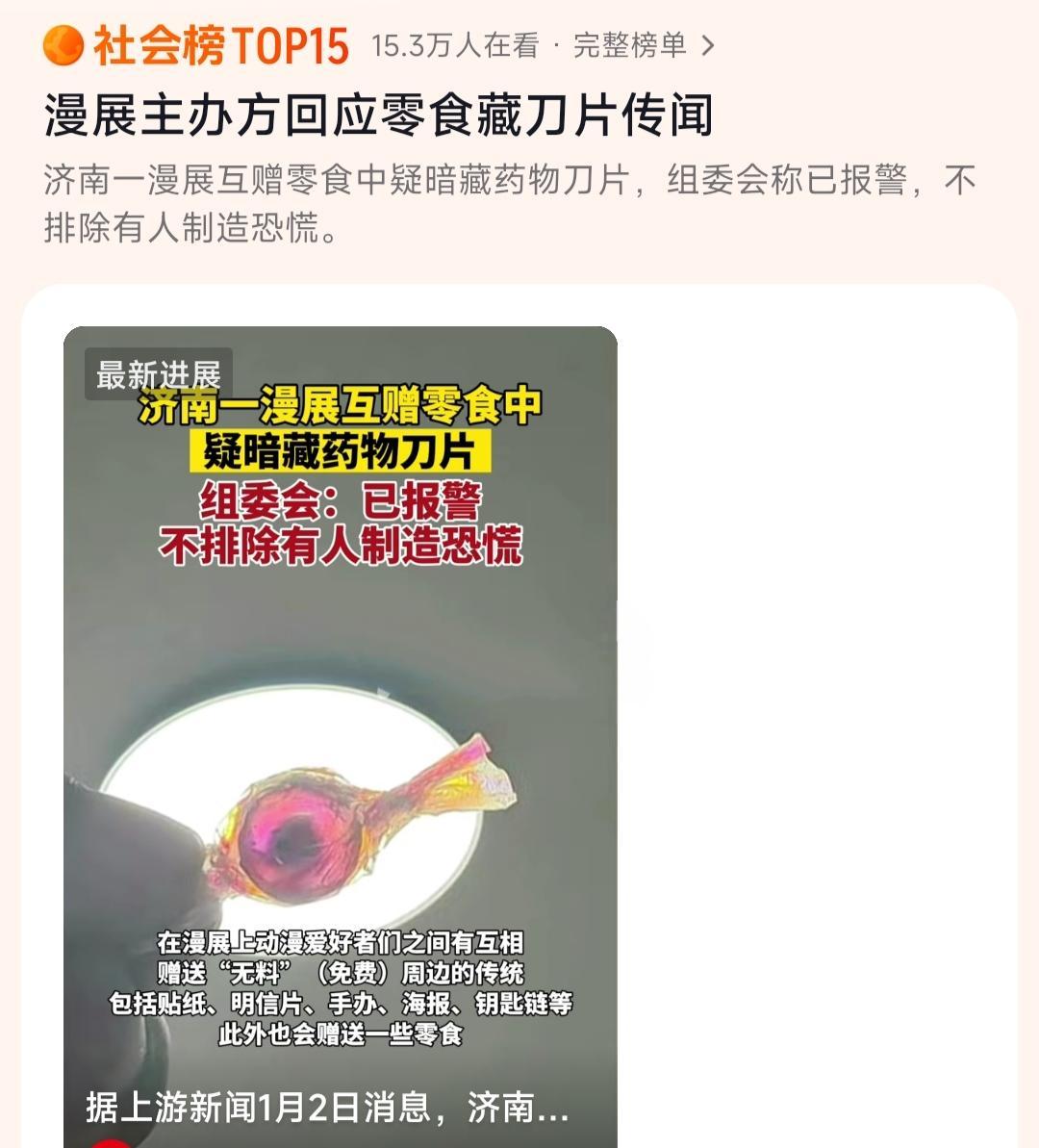 近日,網傳在某漫展上發生了令人震驚的一幕:有人在無料中藏匿刀片和針頭等危險物品,給參與者帶來了極大的安全隱患。
