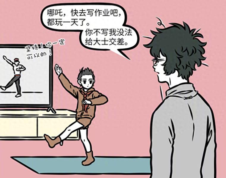 看樣子觀音大士又外出公幹了,一直寄宿在觀音大士家的白澤,不得不充當起第二位家長的身份,監督哪吒寫作業,完成觀音大士交給的任務。只是沒有觀音大士在家,哪吒完全就是放飛的狀態,直到白澤來催促,哪吒都在跳減肥操。