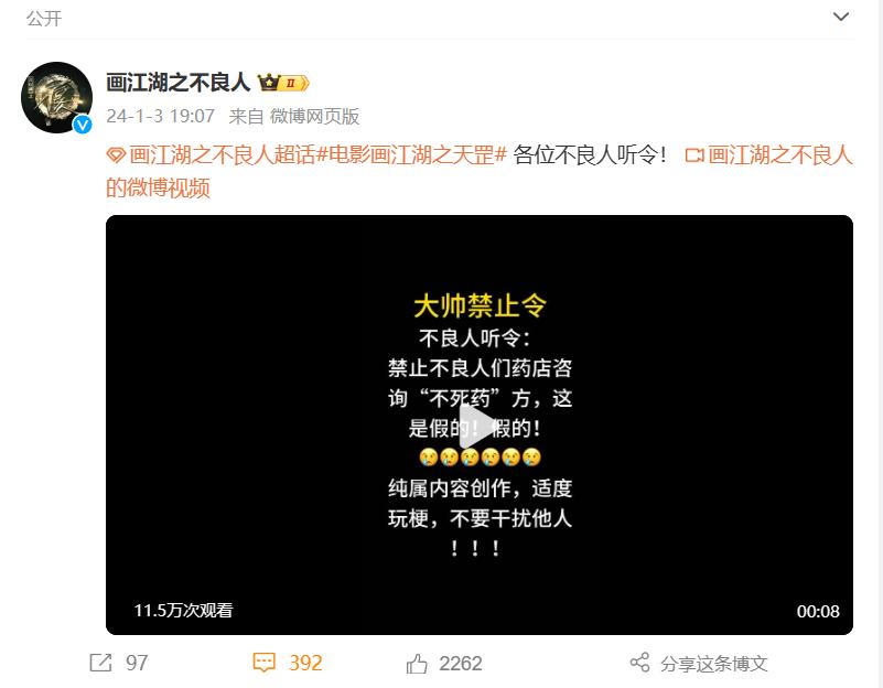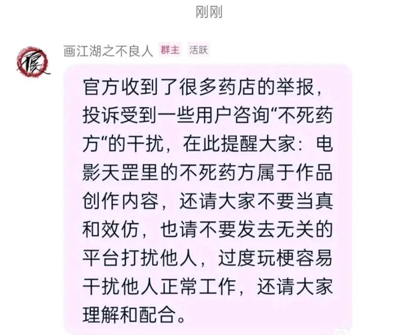 自從天罡傳火爆出圈後,粉絲們便盯上了不死藥方的梗,如果要是網絡上玩梗,或者朋友之間玩梗,也就算了,但是愈演愈烈,直接都造成三次元混亂了。因爲有些粉絲專門跑到一些藥店,找到客服提供不死藥方抓藥,甚至直接詢問不死藥,讓藥房的工作人員不勝其煩。