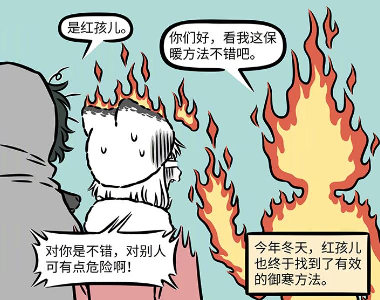 原來紅孩兒找到了最有效的禦寒方法,那就是把自己變成火焰人,畢竟紅孩兒也是有三昧真火的,自己也不懼怕火焰,只要讓火焰包裹住全身,那就能夠輕鬆抵擋寒氣。雖說這個方法對紅孩兒本人不錯,但是卻對其他人有很大的危險隱患。因爲紅孩兒的火焰,可是三昧真火,稍有不慎,就會引發火災,這不九月僅僅是靠近他,自己的帽子就着火了,這也太可怕了吧。