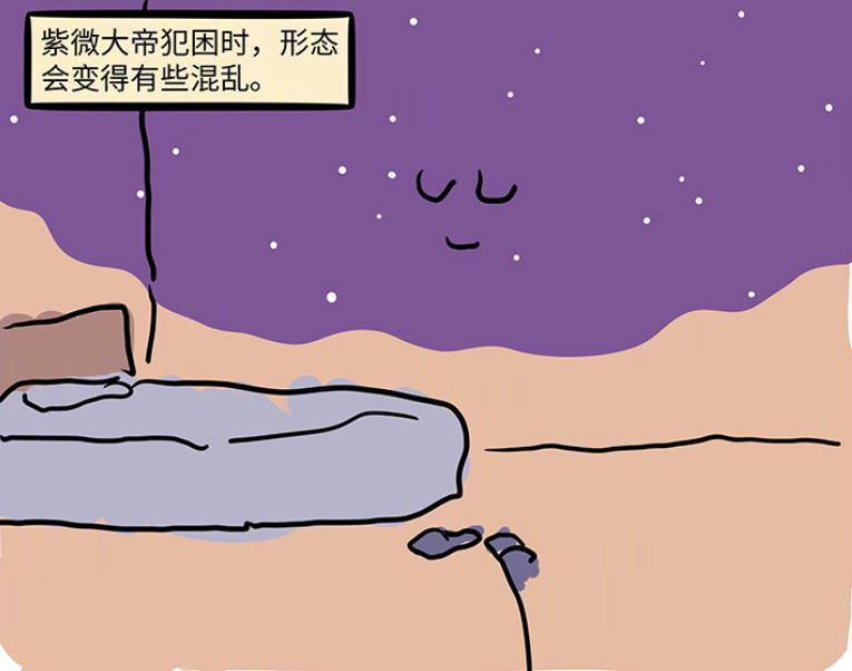 紫薇大帝就不一樣了,他犯困的時候,形態容易變得十分混亂。這不紫薇大帝連人形都維持不了,更別說睡在牀上了,整個人都變成一片星河,依附在牆壁之上。就連一汪空氣大大,都打破了次元壁,也犯困了,第八幅畫面都變得混亂了,內容都沒了,不得不說,一汪空氣大大這可真的做到了工作偷懶,還找不到反駁的理由。