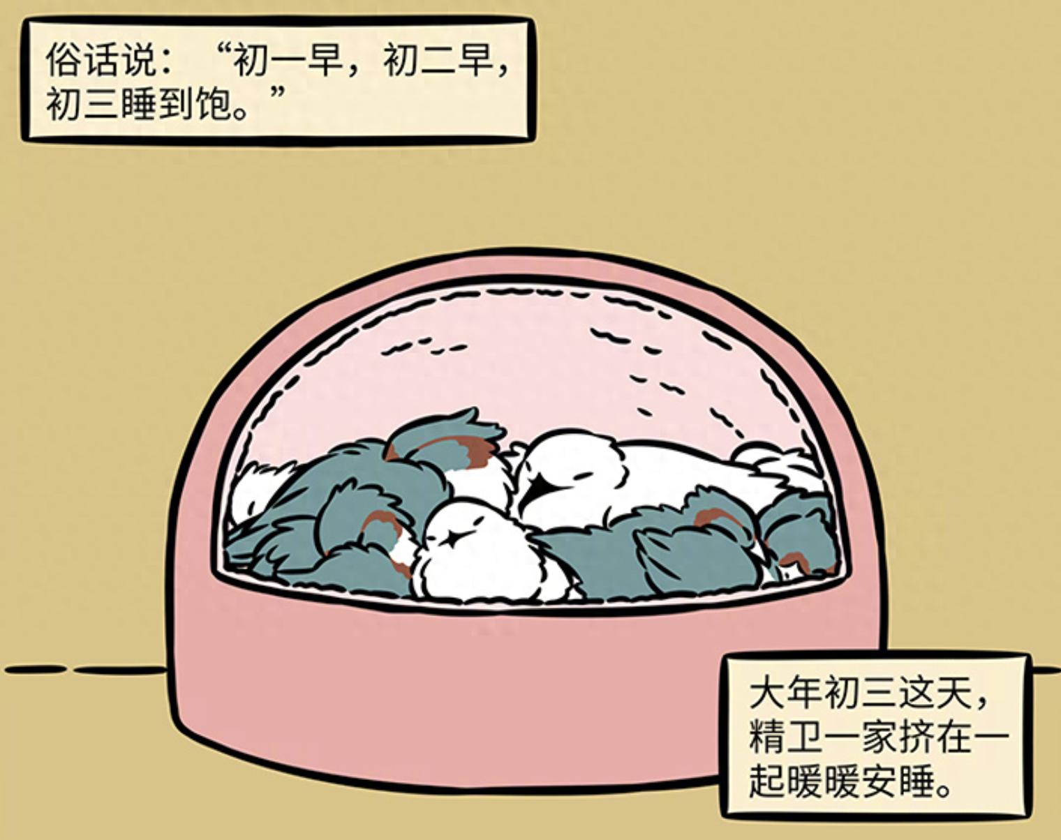 新年正月裏,每天幾乎都有自己的風俗,初一貼對聯,初二祭財神,可謂是十分的忙碌。但是到了初三,大家就可以暫時放鬆一下了。因爲初一早,初二早,初三睡到飽。也就是說大年初三這天,各家各戶都可以睡到自然醒了。而精衛一家全部變回鳥類形態,一起擠在牀上,暖暖的安睡。