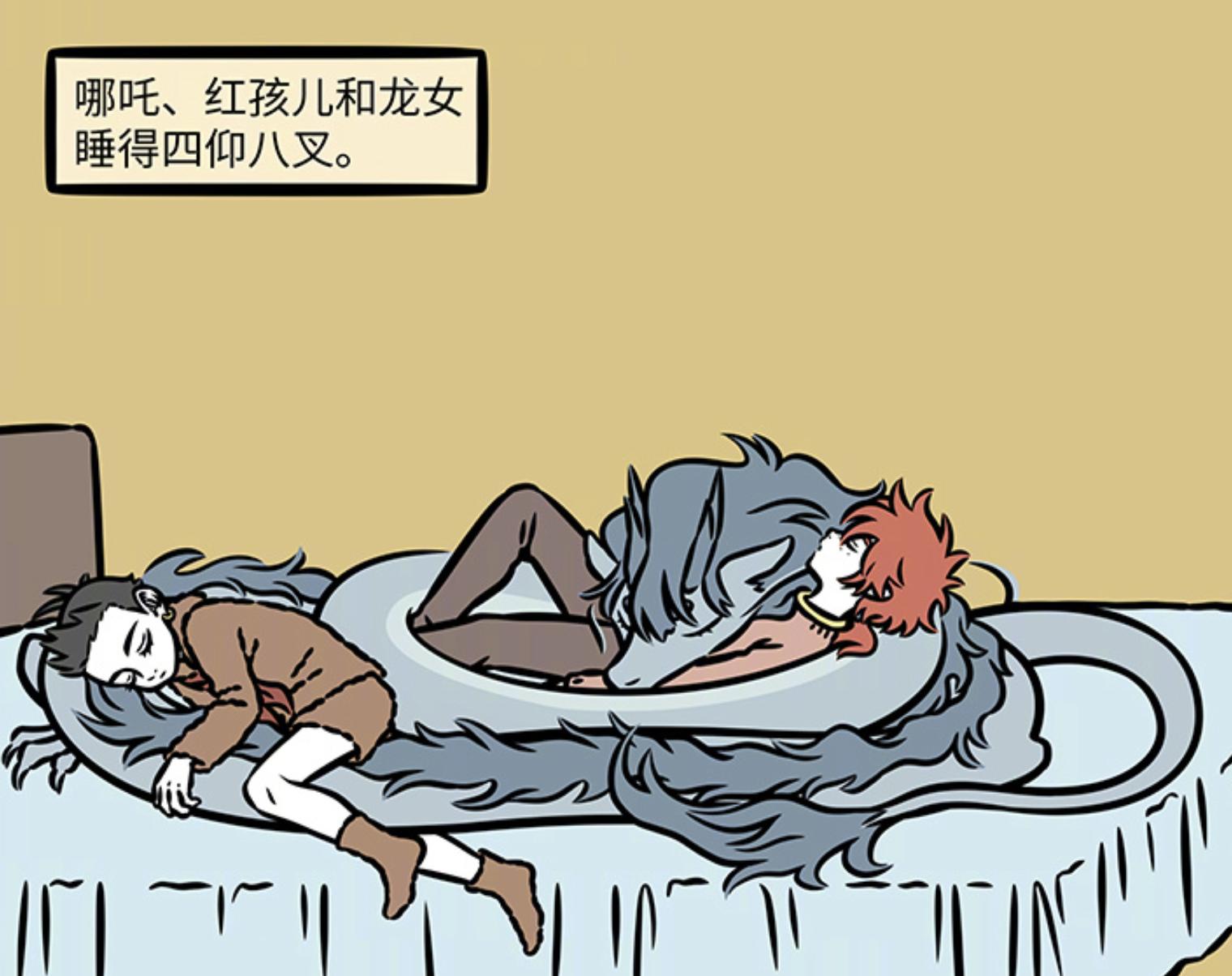 在初三這一天,哪吒與紅孩兒以及龍女總算是可以正大光明的睡懶覺,不用再害怕觀音大士教訓了。他們三人擠在一張牀上,睡得四仰八叉地。不過龍女與紅孩兒卻在趁機撒狗糧,哪吒只能抱着龍女的龍體,而龍女卻把腦袋枕在紅孩兒胸前,看來龍女覺得睡在紅孩兒身上纔有安全感,這下他們倆同牀共枕,着實秀了一把恩愛。