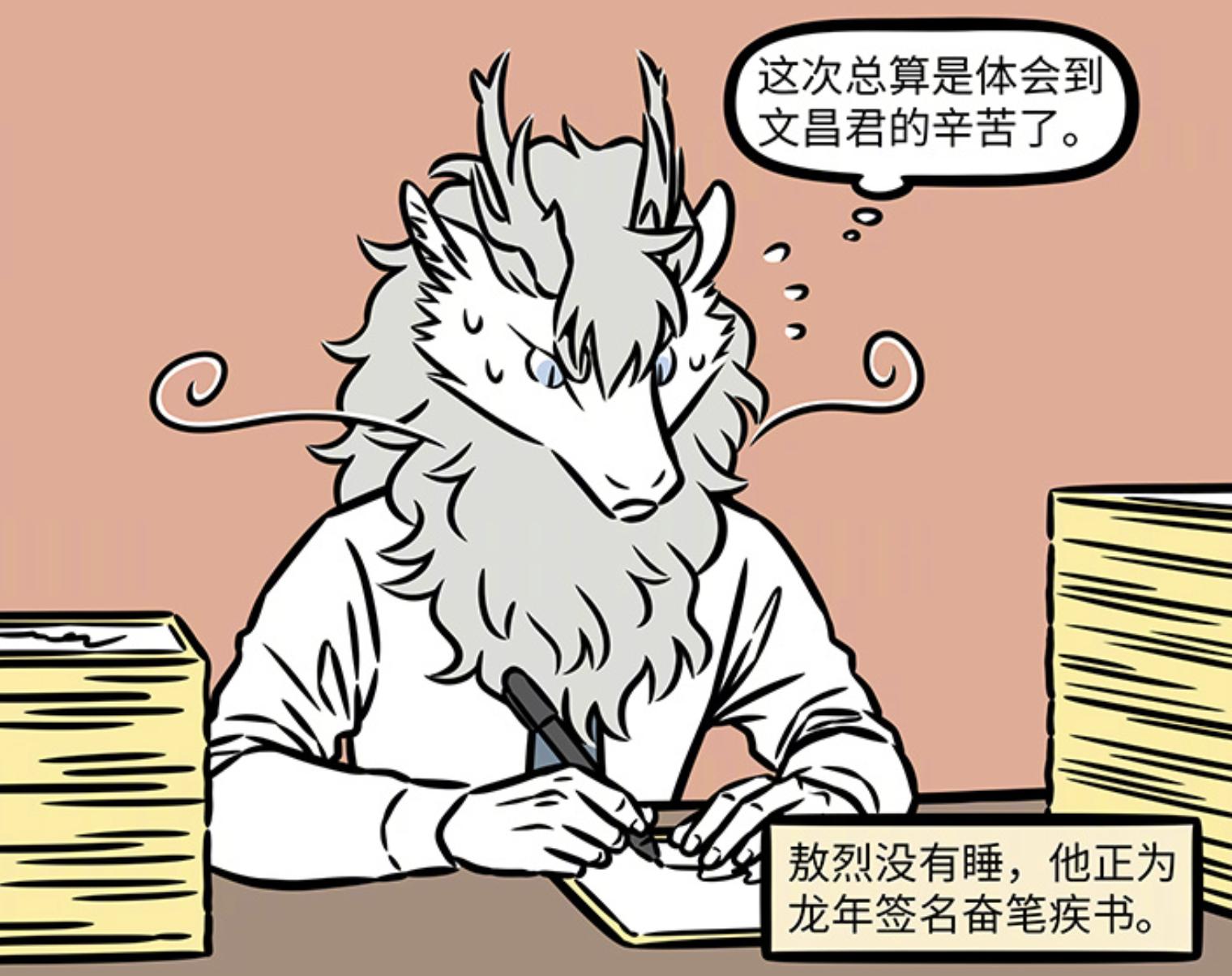很多人都在祈求龍年大吉,而烈烈正在爲龍年簽名奮筆疾書,給大家送祝福呢。看着烈烈身旁,那一摞摞的簽名,這下烈烈可算是體會到了文昌君的辛苦了。而文昌君總算是不再那麼忙碌了,那些學子也在新年暫時放鬆一下,這也給了文昌君休息的時間。看着文昌君桌面上沒有任何的許願,還有不少的可樂罐,可見文昌君暢快的放鬆了一把,而且倒頭就睡了。就是文昌君睡覺的姿態不太舒服,臉朝地趴着睡着了。