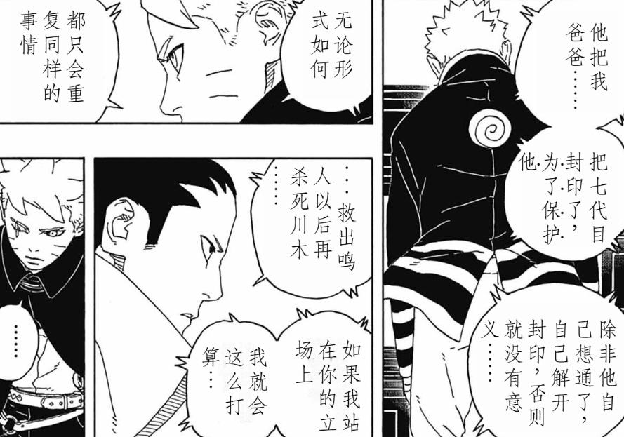 如今漩渦鳴人終於再度登場,只不過並非是川木把他從大黑天裏放出來了,而是回憶閃現而已。因爲漩渦博人與巳月大戰結束後,兩個人也終於可以短暫冷靜下來,好好的談話了。博人告訴了巳月與鹿丸以及井野真相,講述了全能神術篡改記憶的事實,並曝出了自己父親,也就是七代火影鳴人依舊還活着,就關在川木的大黑天之內。