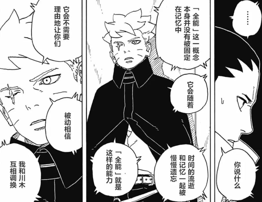 縱觀整個漫畫,要說最厲害的術,恐怕就是全能了。畢竟這是大筒木之神大筒木芝居的神術,可以具現化任何事物,將自己的所思所想化爲真實,能夠影響整個星球的所有人。即便是改造人艾達未能夠施展到全部,卻也能夠讓川木與漩渦博人的身份互換,導致整個星球的人的記憶都發生了篡改。