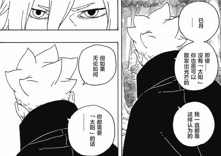 其實巳月已經確定川木不再是照耀自己的太陽,只是不願意承認而已,而博人也是趁熱打鐵,看到巳月居然爲了心中的太陽,不顧自己的性命,內心有所感動,直接對着巳月就曝出了真相,告訴了七代火影未死的真相,同時告訴巳月,自己纔是他的太陽。