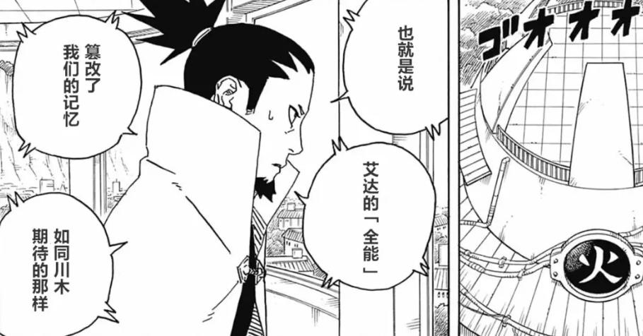 原來博人並不是不高興,而是害怕再次失望而已。從博人與鹿丸的談話中,可以得知神術全能是無法破解的,由於記憶都是真實存在的,即便發現了異樣,神術全能也能夠伴隨着時間的流逝,記憶會重新的被覆蓋掉,讓所有人被動地相信,川木纔是火影之子。