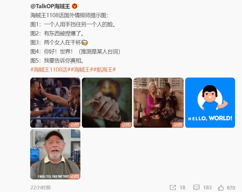 在海外情報師發佈的第四張謎語圖,我們可以見到,某個人說的臺詞,你好,世界。這個就很明顯了,因爲在上一話中,戴彭與土星薩坦的談話中,就明確了黑鬍子要圖謀世界的想法。