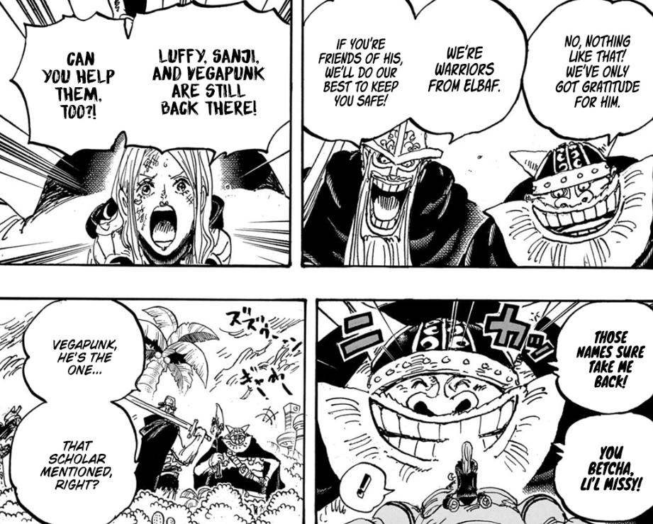 而且東利與布洛基留下了幾名巨人,保護大熊波妮以及弗蘭奇阿特拉斯他們,在漫畫中可以看到,大熊波妮他們總算是安全的逃出來了,而且他們也將登上巨兵海賊團的船隻,等待路飛山治的撤退,一起出發艾爾巴夫了。