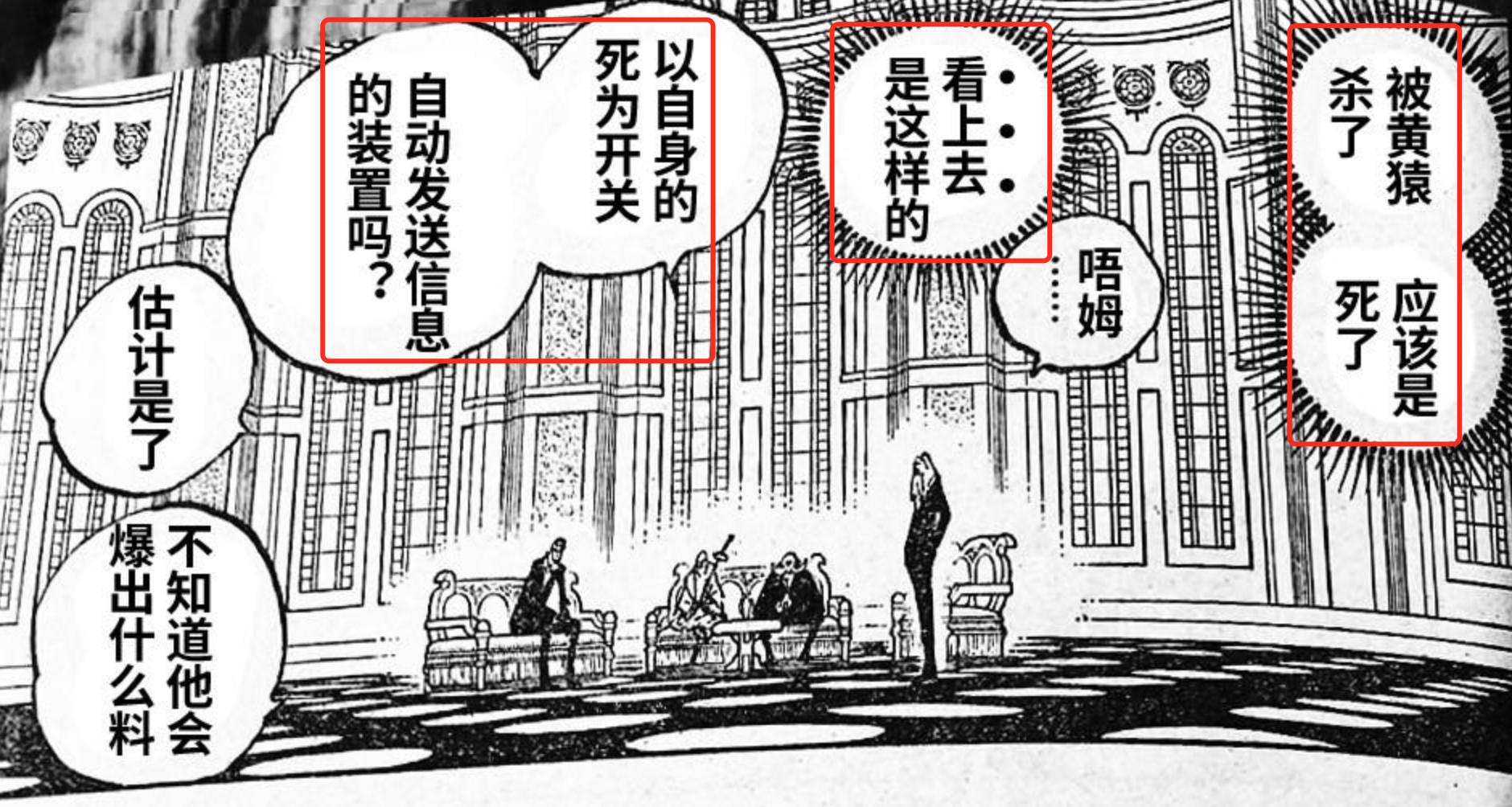 土星認爲貝加龐克開直播是通過死亡所觸發的特殊裝置導致的,所以他相信是黃猿給了貝加龐克最後一擊。但是也有可能是貝加龐克由於傷勢過重而進入半死的階段,陰差陽錯的開啓了自己提前準備好的世界的真相。