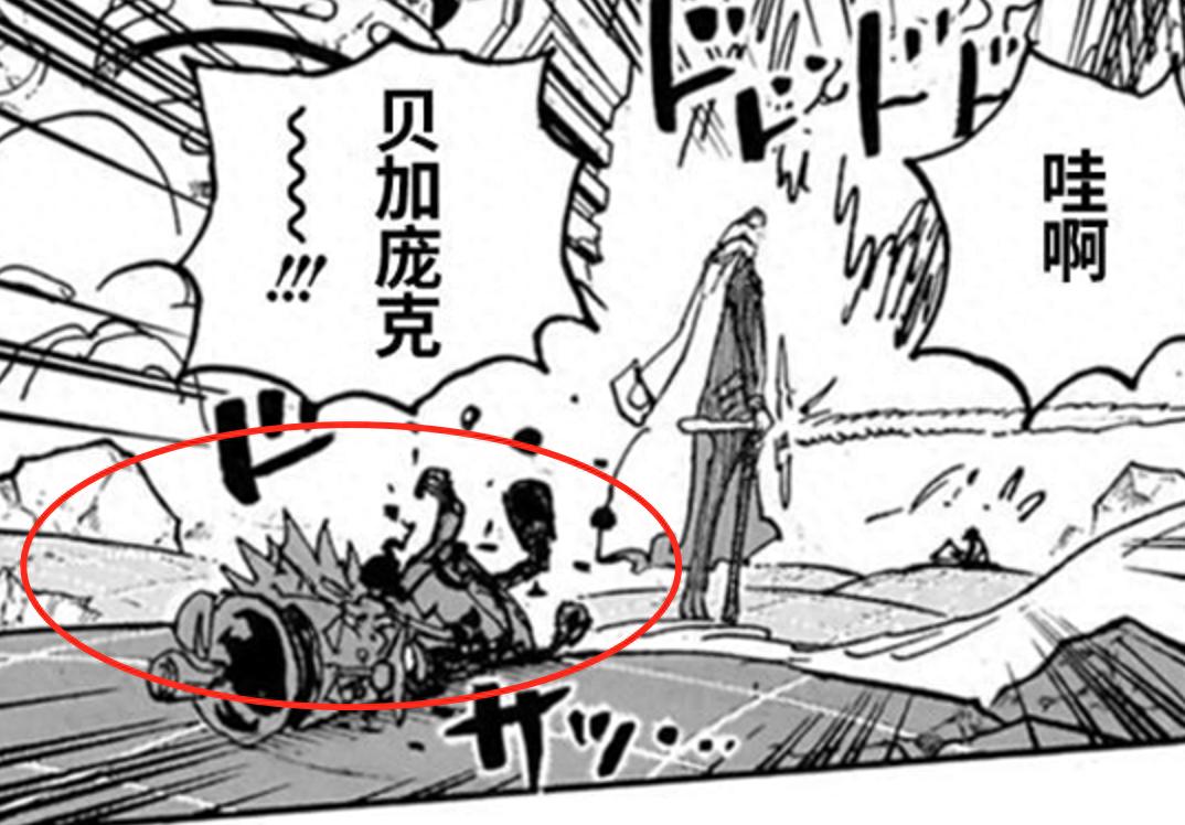 貝加龐克被土星聖搞了一擊後,倒地不起,流血不止。但躺在地上可以降低體內血的流逝速度,一旦移動必將爆發。