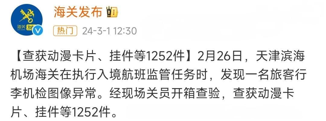 2024年3月1日,根據某官媒相關報道,在2月26日,天津濱海機場海關工作人員查獲了一批動漫周邊。