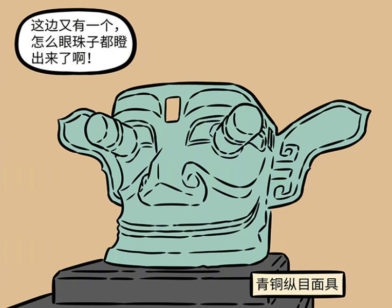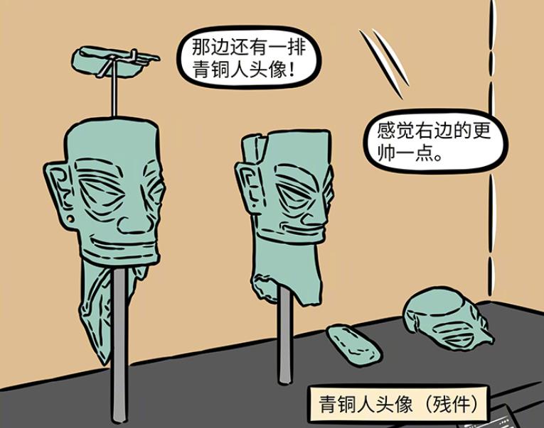只不過這可是博物館,這都是文物,面對黃金面具也只能想想而已。緊接着九月和烈烈繼續逛博物館,發現了一排青銅人頭像,每一個都造型奇特,不得不感慨古人的智慧和創造力,而九月也是覺得右側的青銅人頭像更帥氣。