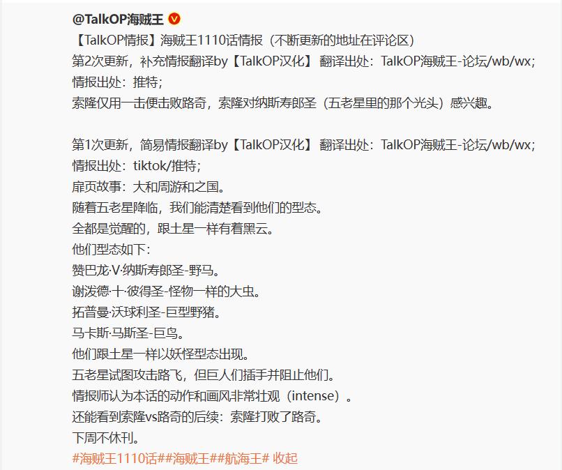海賊王漫畫第1110話的情報終於更新了,這次休刊着實讓大家好等,好在下週連更,而且本話信息量爆棚。不但五老星全員獸形態曝光,而且大戰一觸即發,不過對手變更了,東利布洛基大戰五老星,路飛未能實現一挑五,同時索隆和路奇的大戰也終於分出勝負了,下面就讓我們一起來深入看看吧。