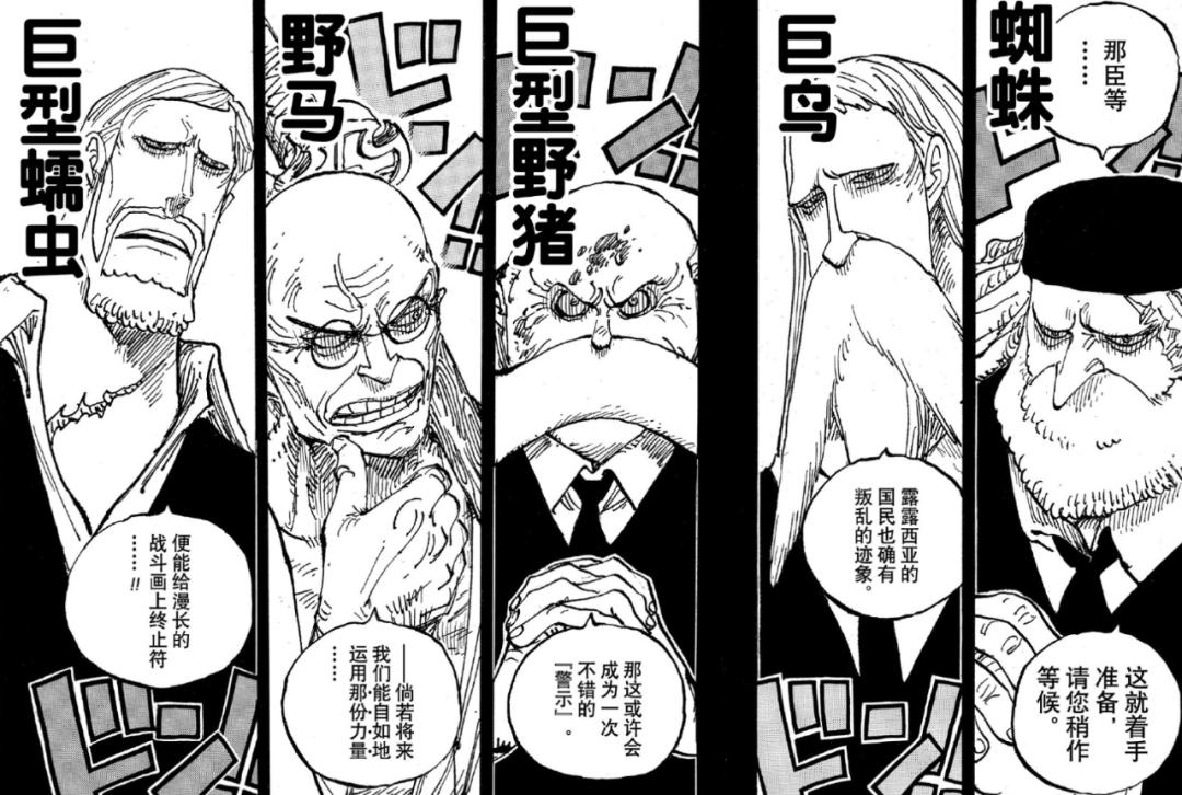 3、五老星攻擊路飛被巨人東利、布洛基阻止。