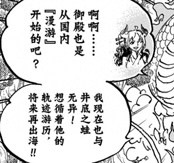 封面上,大和正踏着和之國的土地,開始了她的旅行。扉頁故事中,鬼之島如同被遺忘的巨人,沉睡在大海深處,那是桃之助用火焰雲牽引它走向自由的終點。大和的身影,似乎預示着這個故事的延續,她與斯慕吉等人,以及四皇凱多、大媽的謎團,都還在等待解答。