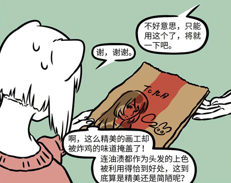 而氧氣老師也是欣然答應,準備找張紙來給九月畫一張籤繪。只是氧氣老師的工作室很久沒有來人了,再加上氧氣老師平時都是用數位屏創作,所以家裏連張紙都沒有,找了很久都沒有找到。但是氧氣老師畢竟答應了九月,不可能讓她空手而歸,於是便直接用炸雞的包裝袋將就一下了。不得不說,氧氣老師很有才,畫的籤繪也很精美好看,連油漬都能用作頭髮的上色,被利用的恰到好處,這下九月可滿足了。