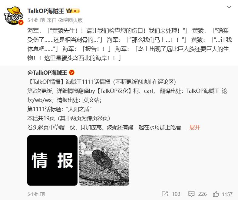 從情報中能夠看到,路飛與五老星繼續大戰,水星沃丘利聖使出非常強大的霸王色霸氣咆哮,這個大招都把路飛的眼睛帽子衣服,還有胸前傷疤,都給吹離了身體,場面一度好笑。好在東利布洛基使出了太陽之盾,擋住下了沃丘利聖的大招。