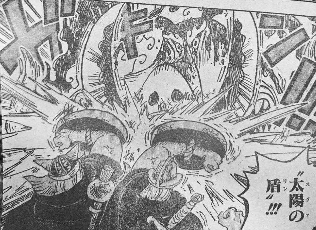 水星沃丘利還化豬牙爲刀刃,企圖攻擊路飛,但東利和布洛基迅速使用“太陽盾瓦林”擋住了攻擊,並以合體技能“隔(Skilja)”將水星沃丘利推開。