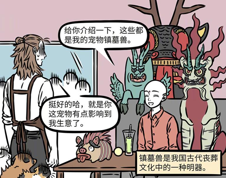 地藏菩薩說到做到,回去沒多久,就帶着自己的新寵物鎮墓獸,來到了楊戩的寵物咖啡店玩耍。雖說楊戩很歡迎毛茸茸的寵物到來,但是他萬萬沒有想到地藏菩薩的新寵物鎮墓獸,長得也太奇葩了,一個個造型奇特,還凶神惡煞的。要知道鎮墓獸其實是我國古代葬墓文化中的一種明器,果然地藏菩薩的寵物就是與衆不同。當地藏菩薩興奮地給三眼哥楊戩介紹自己的新寵物的時候,三眼哥楊戩卻犯難了,因爲鎮墓獸長得太兇狠,嚇壞了不少其他毛茸茸的寵物,這也導致嚴重影響了楊戩的寵物咖啡店的生意,搞得其他客人都不敢進來了。