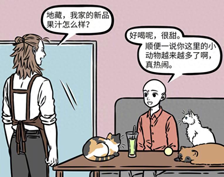 地藏菩薩忙完工作,閒暇之際便會來到三眼哥楊戩的寵物咖啡店,悠閒地喝杯咖啡。三眼哥楊戩也會親自服務地藏,並讓他品嚐自己研製的新品果汁,地藏很貼心地送上真誠的評價,訴說好喝的同時,也讚歎楊戩的寵物咖啡店裏的寵物也越來越多了,比以往更加的熱鬧了。