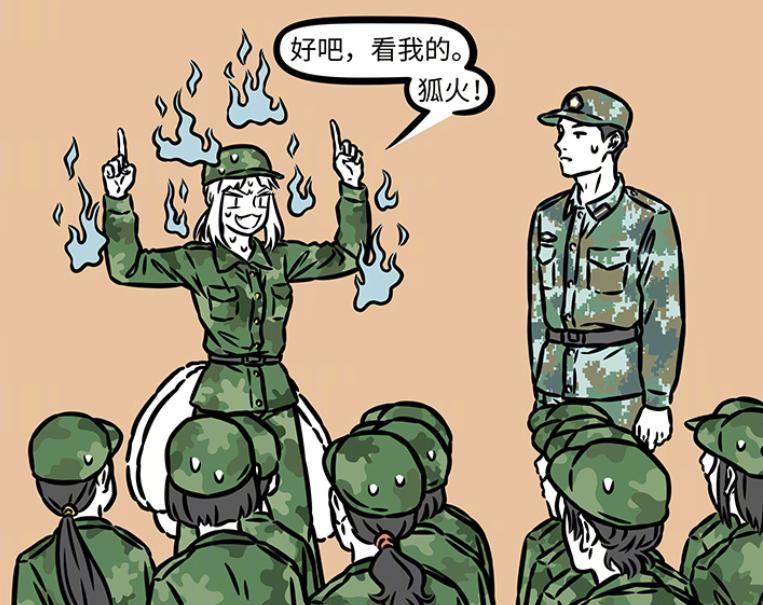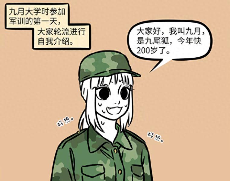 九月也是上過大學的九尾妖狐了,這還是她在非人哉漫畫中,第一次向大家展現她的大學生活。說到大學生活,自然離不開的就是第一堂課,那就是大學軍訓。還別說,九尾穿上迷彩服的樣子,還是蠻可愛的,尤其是帶着迷彩帽子,太有清澈大學生的味道了。