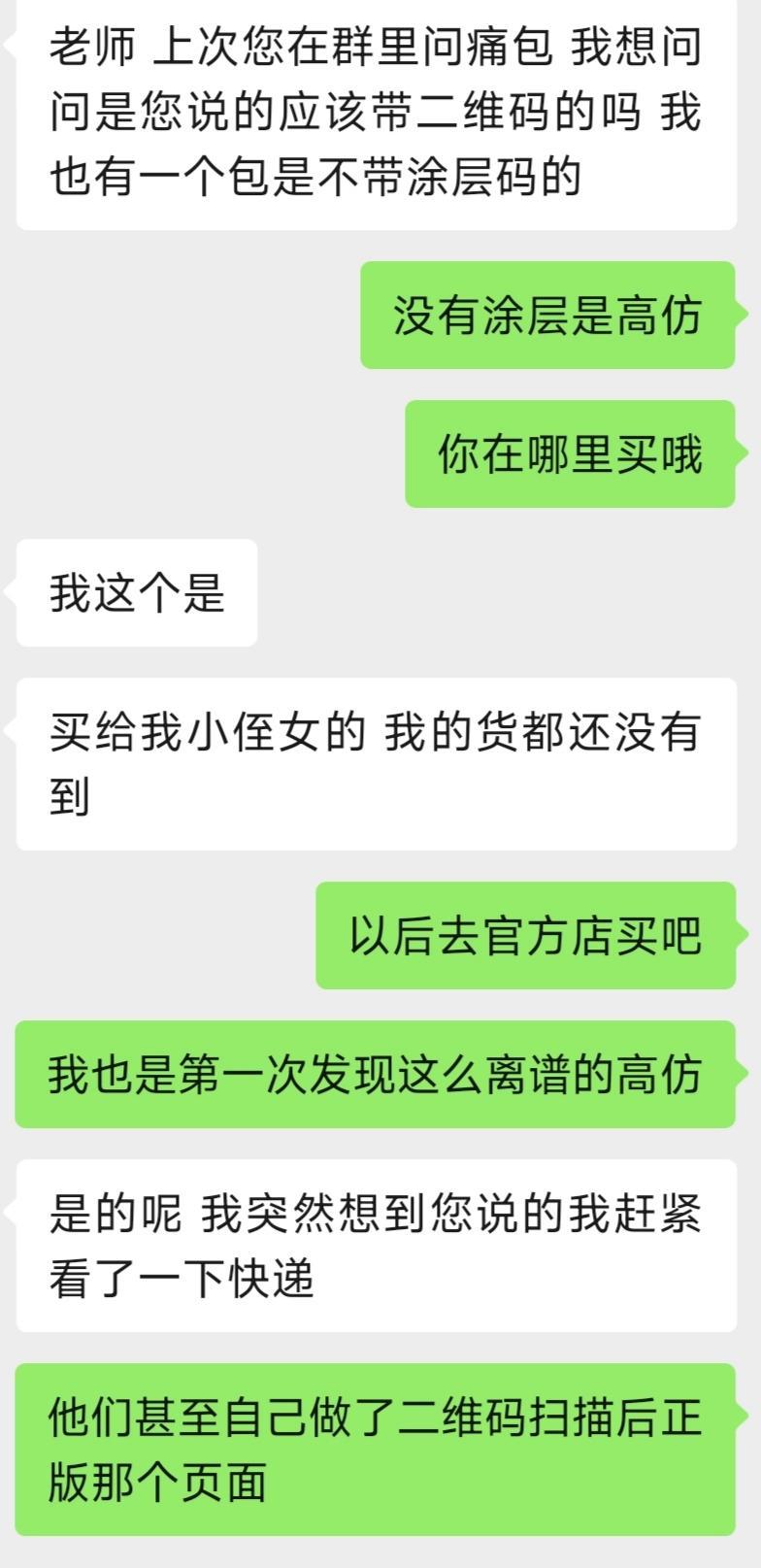 我和那位購買這種缺少防僞塗層痛包的小姐姐溝通後,讓她將自己掃描後得到的防僞鏈接發給了我。