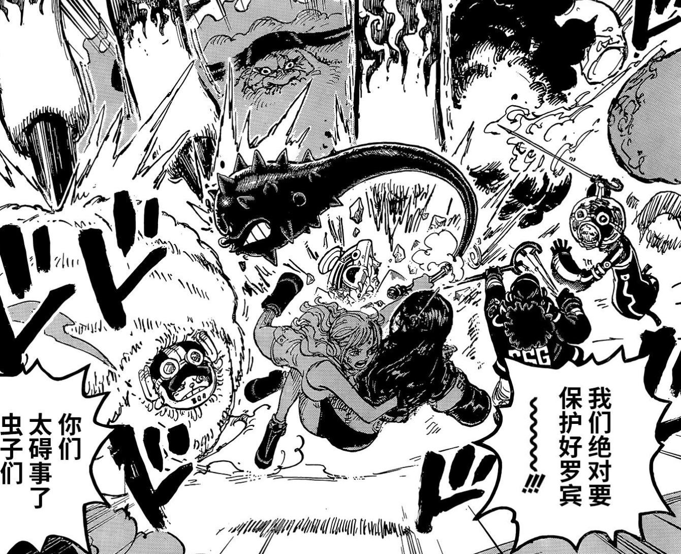 娜美、烏索普、喬巴、布魯克和莉莉絲聯手抵擋土星聖的猛烈進攻,喬巴以毛皮強化阻擋蜘蛛腿,宙斯擊飛指向羅賓的攻擊,烏索普提供掩護,而布魯克則果斷斬斷了對方的蜘蛛腿。