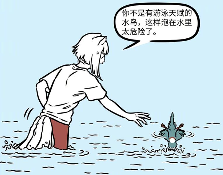 精衛娃離家出走,就是爲了追求自己的夢想,成爲一名游泳健將。正因此,精衛娃被九月救起來之後,還是義無反顧地跳入河中,繼續練習游泳。看着精衛娃在河水中撲騰撲騰的樣子,直呼趕緊讓它上來,別做無用功了。