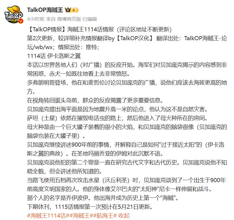 海賊王漫畫第1114話的第二波情報終於來臨了,信息量比之前還是蠻多了,除了貝加龐克繼續爆料世界真相之外,當屬喬伊波伊的登場相當炸裂。不過明哥與麥哲倫也會出場,連伊姆大人也再度現身,只是表情不容樂觀。同時路飛的戰鬥繼續,再次變身五檔尼卡形態,第三次大戰水星沃丘利聖,下面就讓我們一起來深入看看吧。