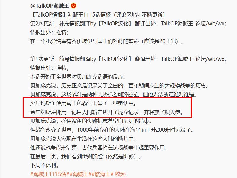 海賊王漫畫第1115話的情報終於更新了,雖然苦等了兩週時間,但是沒讓海迷們白白等候,情報還是蠻吸晴,蠻炸裂的。喬伊波伊曾對峙二十王,也是敗於伊姆大人之手。不過五老星的表現也讓人好奇,金星從山治手裏逃走了,熾天使來襲,火星也曝光擁有霸王色霸氣,下面就讓我們一起來深入看看吧。