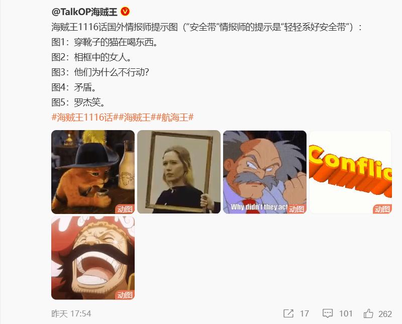 情報師已經發布了五個謎語圖,前兩個說真的,不是很好判斷。有人說穿靴子的貓在喝東西,指得是鷹眼,也有人說相框中的女人,指得是莉莉國王,不過衆說紛紜,沒有爭辯出一個結果。反倒是第三個謎語圖,“他們爲什麼不行動”,海迷們都比較胸有成竹,基本都認爲說得就是熾天使。